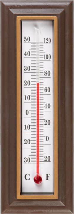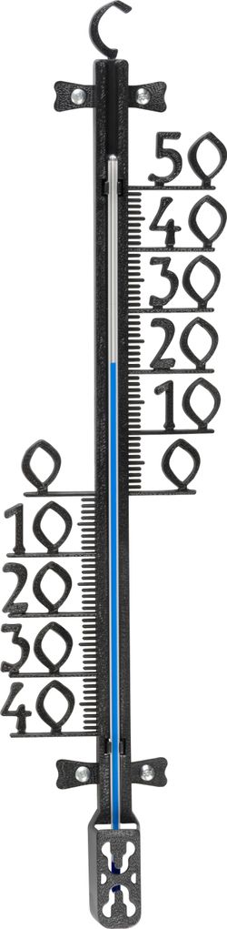 Vonkajší kovový teplomer Strend Pro meria teplotu v rozsahu od 50°C do -40°C. Rozmery: 245x80x28 mm.