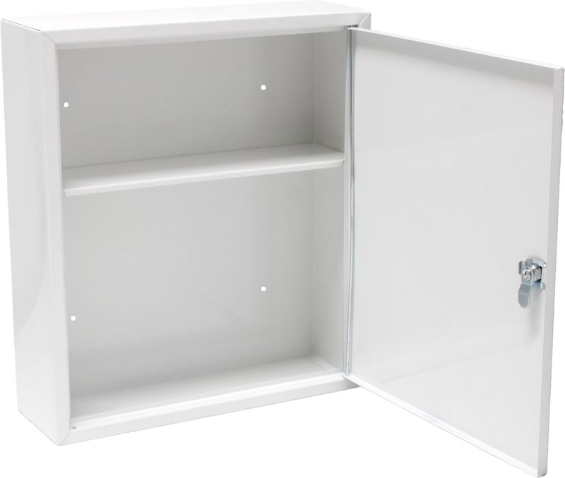 Lekárnička je vybavená cylindrickým zámkom s kľúčom, ktorý zabraňuje neoprávnenému prístupu – ideálne riešenie najmä v priestoroch, kde sa pohybujú deti. Na predných dverách je jasne viditeľné medzinárodné označenie prvej pomoci (zelený štvorec s bielym krížom), čo umožňuje rýchlu orientáciu aj v stresových situáciách. Robustná kovová skrinka zaručuje dlhú životnosť a odolnosť voči mechanickému poškodeniu.