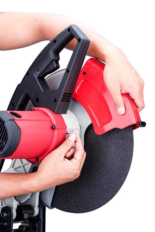 Any other uses of or modifications to the machine are deemed to be improper usage and may result in serious physical injury. The saw has a handle that is used to turn on and off.