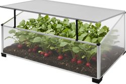 Greenhouse Greenhouse is suitable for the garden, perfectly protects against pests and weather influences. You can grow herbs, low vegetables or fruit in it. It is made of polycarbonate (thickness 4 mm) and aluminum. Durable polycarbonate panels protect against hail and filter up to 99.9% of harmful UV radiation. You can unfold the roof of both sides. Dimensions of the greenhouse: 100x100x30 cm, at the highest middle point it has a height of 40 cm.