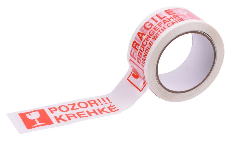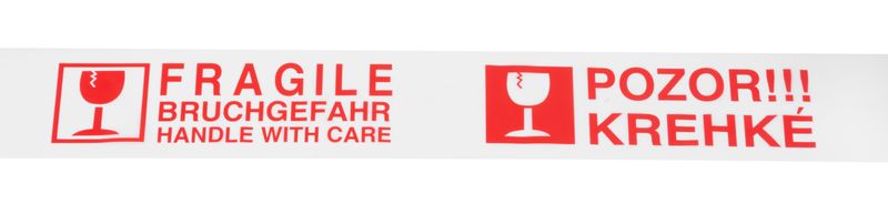 Adhesive warning acrylic tape that is used to mark packages or goods with a fragile content where it is necessary to draw attention to the brittle content inside the package or pallet. Tape thickness 48 microns Tape size 50mm x 66 meters