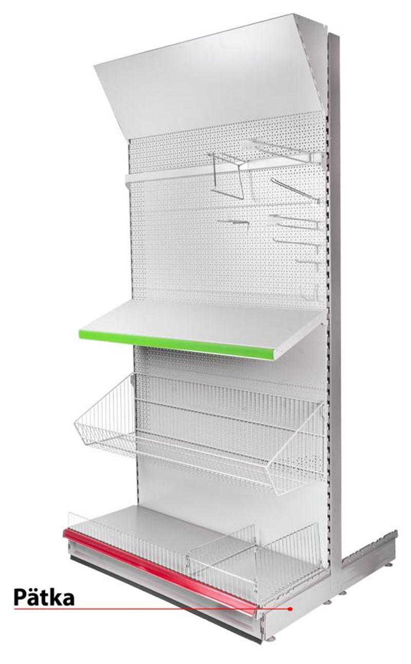 Foot for advertising stand. Attaches to shelves, racks. In red and green color