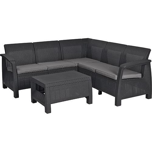 The terrace set is a stylish and practical accessory for any terrace or garden. The set consists of a table and a corner sofa. The sofa provides space for the seating of five people. The surface of the furniture is made of polypropylene, which is a more modern substitute for rattan. The advantage of this material is its high resistance to UV radiation and weather conditions. Thanks to this, it is possible to store furniture outdoors for a long time, there is no risk of damage from the sun or rain. The whole set looks like an attractive modern design and is in graphite color. Assembly of the set is very simple, no need to use special tools. The dimensions of the table are 80 x 60 x 40 cm and the dimensions of the sofa are 182 x 182 x 80 cm. The set includes seat cushions in gray.