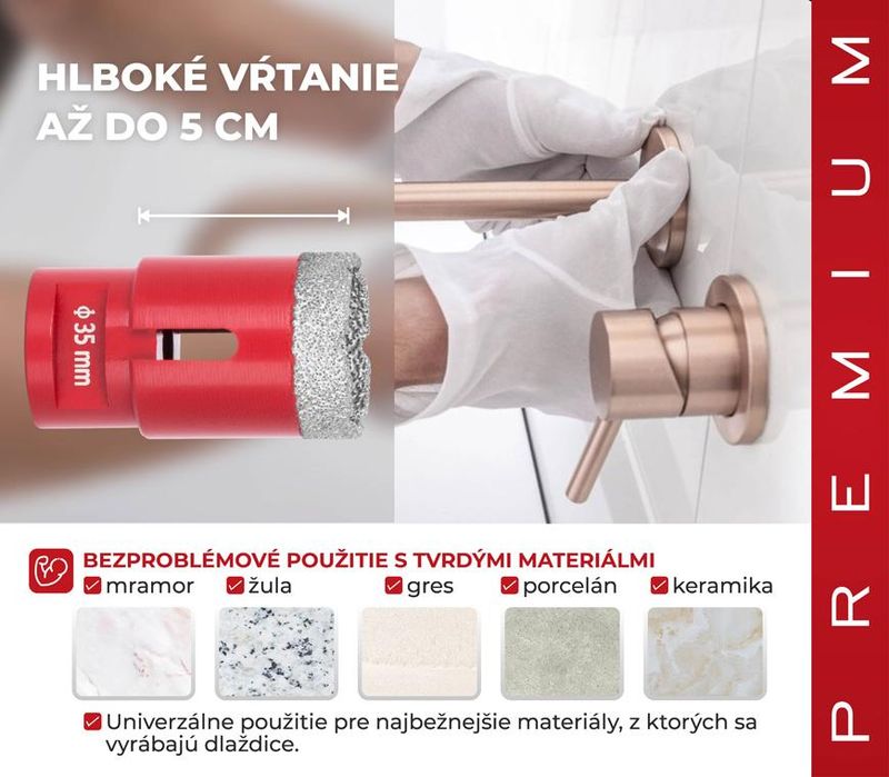 - Industrial class - suitable for all types of hardened stone and its compounds, ceramic tiles, marble, granite and gres - diamond width 10 mm - for dry drilling