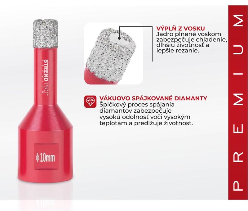 - Industrial class - suitable for all types of hardened stone and its compounds, ceramic tiles, marble, granite and gres - diamond width 10 mm - for dry drilling