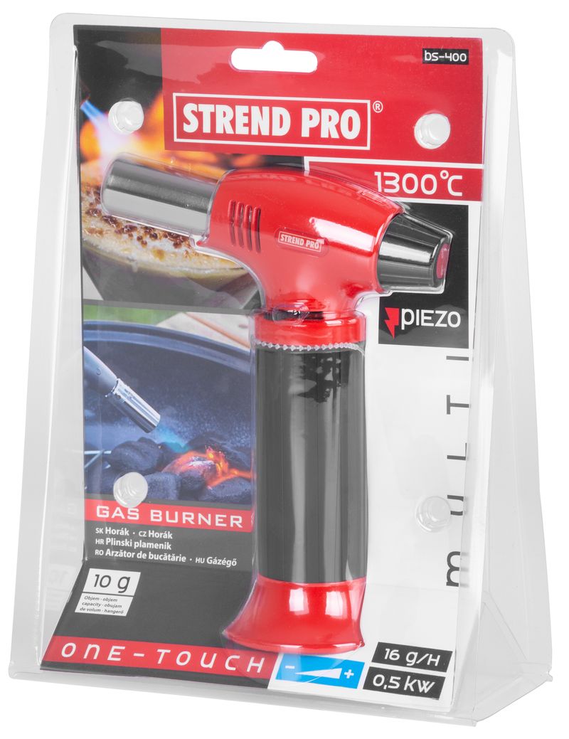 Gas burner Strend Pro GB7018 with a nozzle diameter of 19 mm is suitable for flambéing, caramelizing, roasting or adding texture and color to food. Gas burner will take care of the final preparation of meals for the presentation. You can also use it to light grills, defrost meat, gardening, or micro welding. The maximum burner temperature reaches 1300 ° C. The burner has an integrated gas container in the handle with a volume of 10 ml.