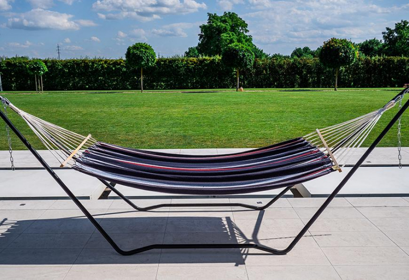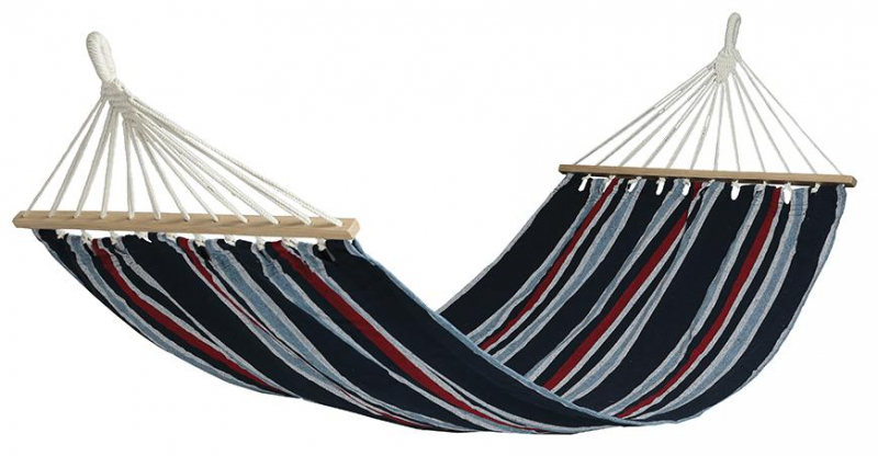 A hanging hammock is a great way to relax in the event or in the garden. The net is strong, made of comfortable cotton. Its cover is a pleasant combination of blue, red and white. The dimensions of the lying area are 200 x 150 cm. At both ends of the net there are holes for ropes, through which it is necessary to tie the net between 2, sufficiently distant trees. Make sure that the ropes are tied sufficiently. The load capacity of the net is 120 kg.
