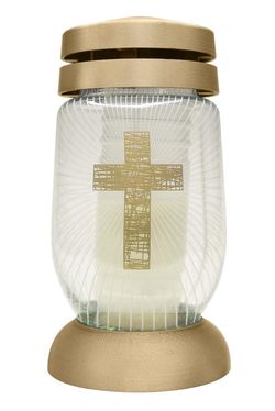 A candle with an image of Mary in shades of blue with silver accents. Made of high-quality clear glass, through which the flame is beautifully visible. Thanks to its large base, it is very stable, and thanks to its special structure and "cap", the insert inside is perfectly protected against wind and water. Elegant and modern, it looks great as the main decoration of tombstones. Burning time: 36 hours.