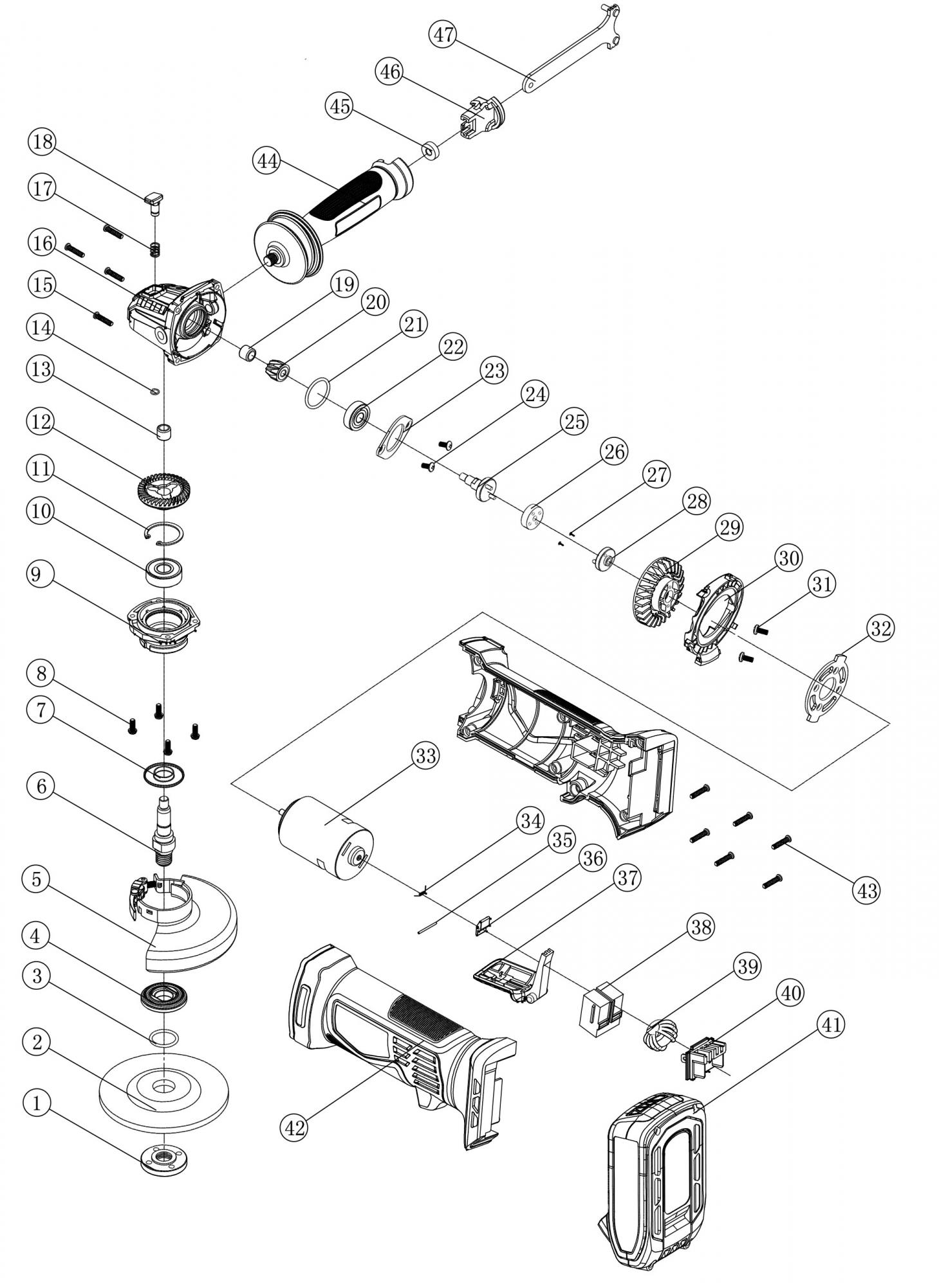 The grinder can only be used with an additional handle! The additional handle with a soft pad dampens vibrations and at the same time provides comfort and safety. Normal charging time is about 1 - 1.5 hours. The battery is protected against overcharging by a thermal fuse, so it can remain in the charger for a long time without damage (however, not longer than 24 hours). The battery and charger are not included.