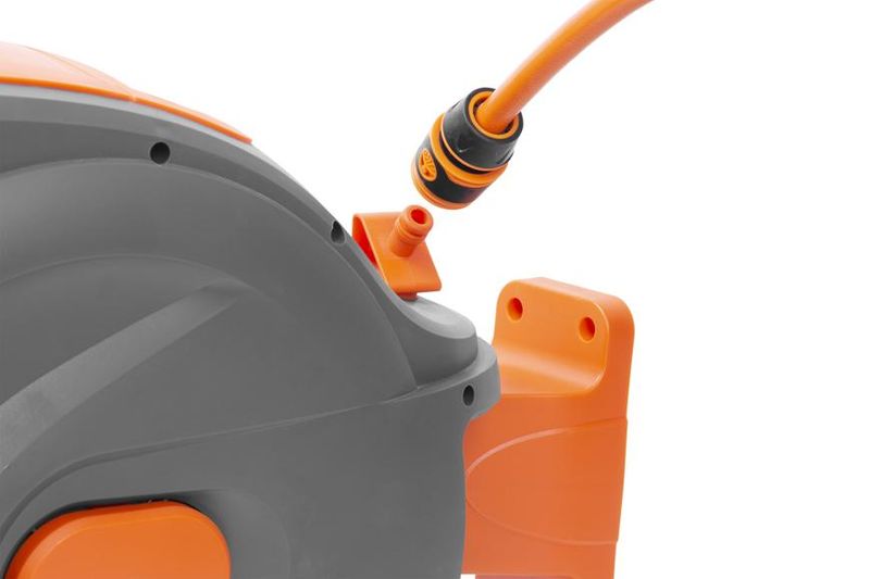 The practical Strend Pro Premium wall-mounted hose reel features a huge internal capacity, elegant design, and robust construction. The unit can be easily removed from the bracket by pulling the pin and disconnecting from the water tap, so you don't have to worry about the hose being damaged by frost in winter. The mounting bracket rotates 180°. The hose can be stopped almost exactly to the centimeter thanks to the patented variable position lock. Working pressure: 10-25 bar. Accessories: 30m+2m 1/2" hose, adjustable nozzle + 2x quick connector + tap connector with reducer + 180° rotatable wall bracket and mounting hardware.