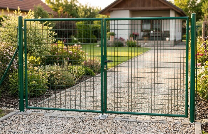 Garden double-leaf gate with welded mesh infill with mesh size 50 x 100 mm and wire thickness of 3.5 mm. The post diameter is 76 mm. Finish is zinc + PVC. Color green.