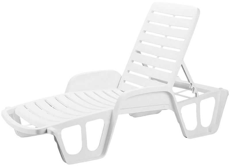 The white plastic deck chair is suitable for outdoor placement in the garden or on the beach. The lounger can be adjusted to several positions, from sitting to lying down. It is a practical and functional accessory. Maximum load is 100 kg.