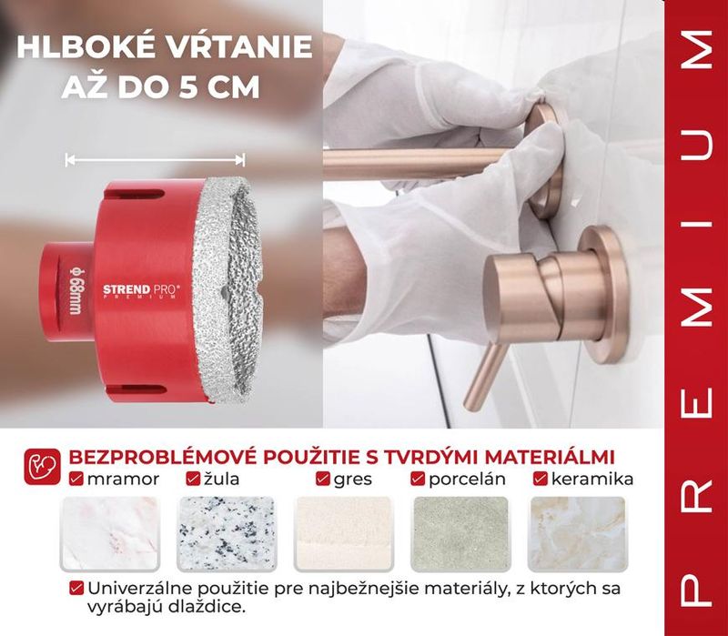 Sada vyrezávačov Strend Pro Premium je vhodná na vyrezávanie všetkých druhov tvrdeného kameňa a jeho zlúčenín, keramických dlaždíc, mramoru, gresu, porcelánu a žuly. Špičkový proces spájania diamantov zabezpečuje vysokú odolnosť voči vysokým teplotám a predlžuje životnosť. Extrémne ľahké rezanie a vysoká výkonnosť pri vykružovaní. Perfektne ju využijete pri montáži kúpeľnovej sanity a príslušenstva, inštalácii káblov, elektrického vedenia, radiátorov atď. Je použiteľná s akoukoľvek vŕtačkou s použitím vhodného adaptéru. Typ upínania: M14, Ø vyrezávačov je 20, 35, 45, 55 a 68 mm.