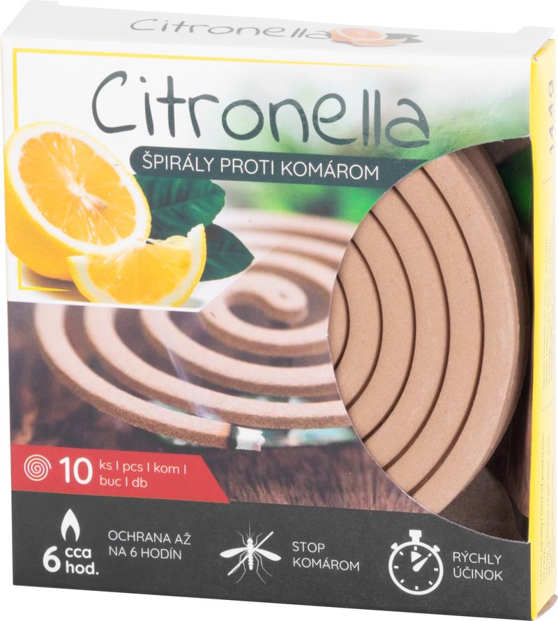 Insecticide spiral Citronella with a fast effect and citrus scent is designed to repel mosquitoes for outdoor use - on balconies, gardens or terraces. Burning time: 6 hours. Package contents: 10 spirals, 1 base.