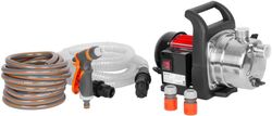 The garden pump with accessories is a great helper for pumping clean, rainwater, or chlorinated water (e.g., in swimming pools). The garden pump is most often used for irrigation and watering, pumping and emptying tanks (e.g., swimming pools), pumping water from wells, rain barrels, and cisterns. The pump has a powerful 1000 W motor, powered by electricity from a 230 V source. You connect the pump to the power outlet using a 1.2 m long power cable. The pump provides a flow rate of 3,400 l of water per hour and a maximum head of 44 m. The SET includes: pump, 1” x 3.5 m suction hose, 1/2” x 7 m 3-layer garden hose, 2x 1/2” quick couplings, and an adjustable nozzle with 2 functions.