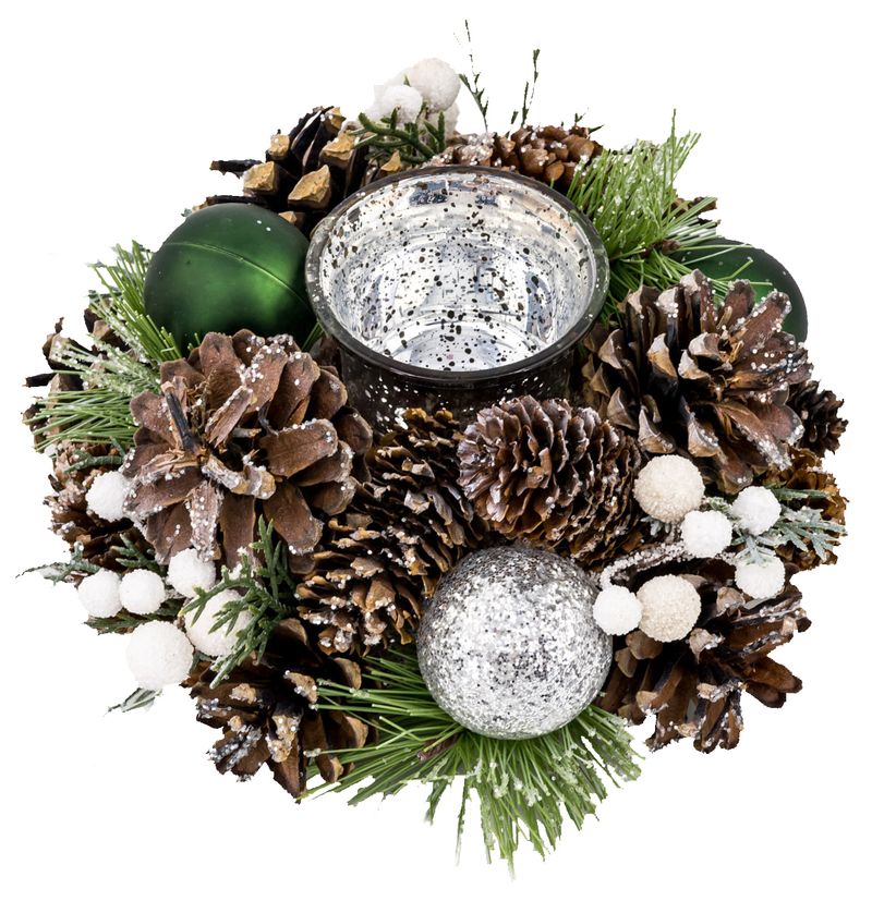 Ikebana MagicHome Vianoce, prírodná, so zelenými guľami, na sviečku