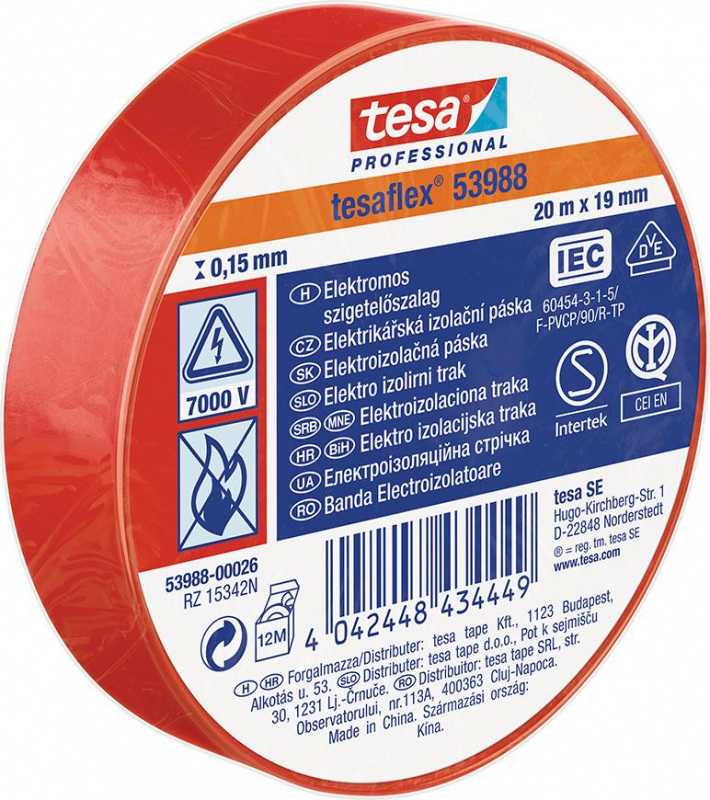 Páska tesa® PRO tesaflex®, elektroizolačná, lepiaca, sPVC, 19 mm, červená, L-20 m