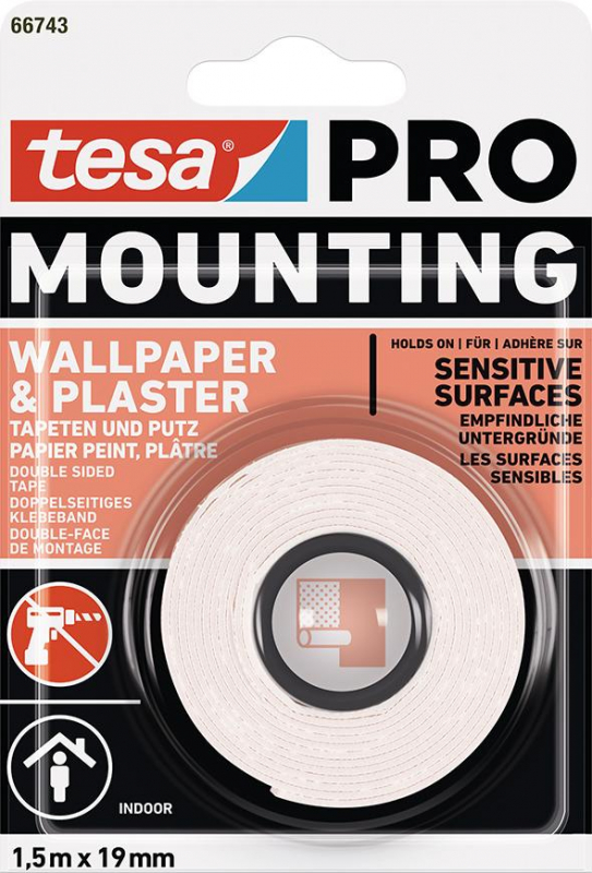 - Trvácne a spoľahlivé upevnenie bez poškodenia steny: Montážna páska tesa PRO Mounting Wallpaper & Plaster posiela skrutky, hmoždinky aj klince do starého železa – na rýchlu a jednoduchú montáž bez použitia náradia