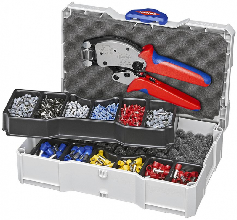 Obsah: 1 x 97 90 00 LE KNIPEX TANOS MINI-systainer®, 1 x 97 53 18 KNIPEX Twistor®16 Automatické lisovacie kliešte pre dutinky s otocnou nástavcovou hlavou (0,14 – 16 mm˛), 200 x KNIPEX Izolované dutinky 14 / 8 mm (0,5 mm˛), 200 x KNIPEX Izolované dutinky 14 / 8 mm (0,75 mm˛), 200 x KNIPEX Izolované dutinky 14 / 8 mm (1 mm˛), 200 x KNIPEX Izolované dutinky 14 / 8 mm (1,5 mm˛), 150 x KNIPEX Izolované dutinky 14 / 8 mm (2,5 mm˛), 75 x KNIPEX Izolované dutinky 17 / 10 mm (4 mm˛), 75 x KNIPEX Izolované dutinky 20 / 12 mm (6 mm˛), 50 x KNIPEX Izolované dutinky 22 / 12 mm (10 mm˛), 40 x KNIPEX Izolované dutinky 24 / 12 mm (16 mm˛),
