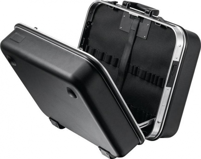 Volne stojace vo všetkých otváracích polohách vdaka zacvakávacím držiakom veka so závesným mechanizmom na oboch stranách, uhol volne nastavitelný. Možno otvorit z jednej alebo oboch strán; dno a veko možno otvorit nezávisle od seba. Pole etikety s dvomi nálepkami pre individuálne oznacenie. Max. užitocné zataženie: 25 kg. Objem: 38 litrov. Vysokozatažitelný ABS materiál, cierny. Obvodový hliníkový rám s bezpecne namontovanou, pevnou strednou stenou, ktorá môže byt vybavená náradím z oboch strán, s rôznymi možnostami výbavy vdaka elastickým sluckám a dvanástim malým vreckám. Kovové závesy. Trojcíslicový kombinacný zámok pre bezpecné uzamknutie kufra. 2 sklopné zámky k uzamknutiu veka a vanicky. Vyberatelná priehradka na dokumenty a vyberatelná doska na náradie vyrobená zo špinu odpudzujúcich dvojstenných PP dosiek s 13 vreckami na náradie. Spodné veko, môže byt zopnuté, výška 58 mm, môže byt rozdelené flexibilnými vložkami; krycia doska so šiestimi velkými priehradkami. S celkovo 95 možnostami vloženia.