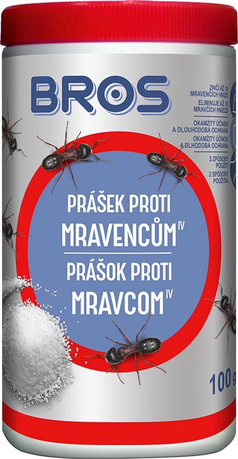 Bros ant powder is intended for use in indoor areas and the immediate vicinity of homes, such as garages, terraces, driveways, garden sheds, etc. - The powder contains a special substance that attracts ants and acts on contact, thus destroying nests as well. - Destroys up to 10 nests. USE: Ant-infested areas are watered with an aqueous solution of the powder. Dissolve 100g of powder in 2.5 liters of water, mix thoroughly, and apply immediately.