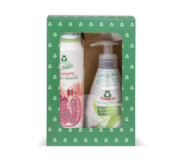 Súprava s vôňou granátového jablka obsahuje sprchový gél a tekuté mydlo v dávkovači. Jemné zloženie kozmetiky Frosch na prírodnej báze má neutrálne pH 5,5 a je vhodné aj pre citlivú pokožku. Výťažky z granátového jablka regenerujú pokožku a zabraňujú jej starnutiu. Prípravky neobsahujú škodlivé chemické látky, ako sú parabény, ropné deriváty, mikroplasty ani EDTA. Pantenol obsiahnutý v sprchovom géle pokožku hydratuje.