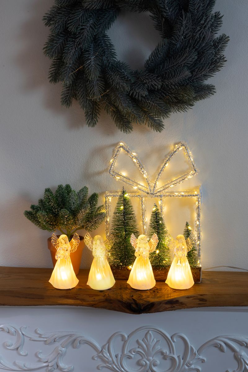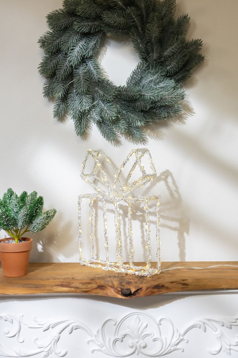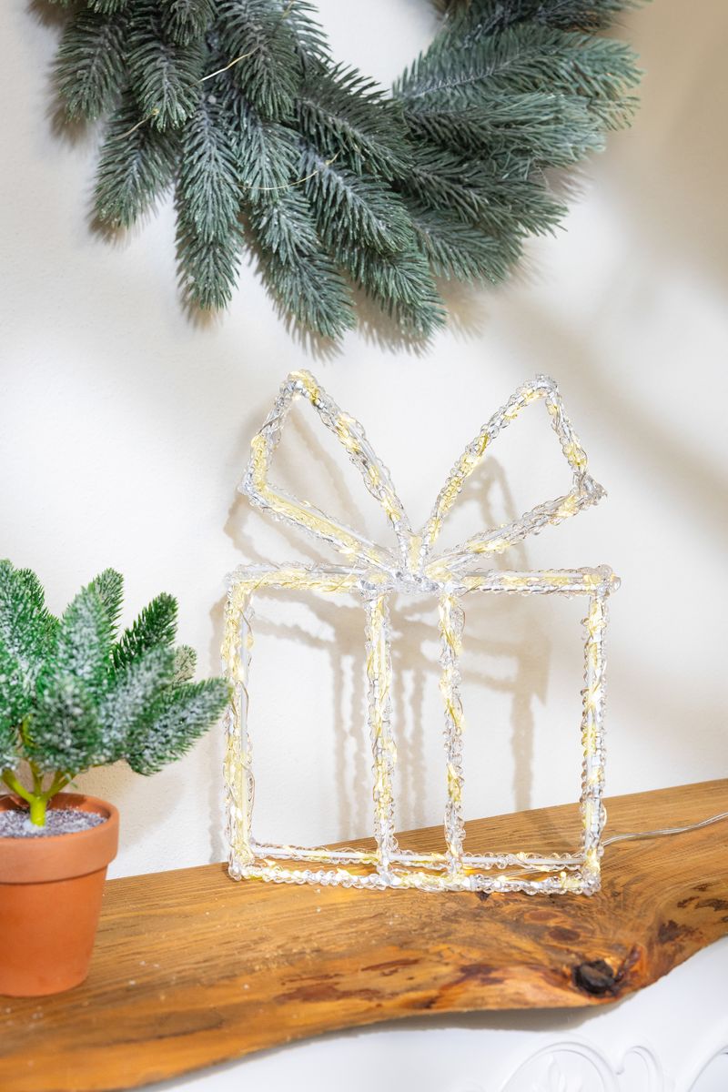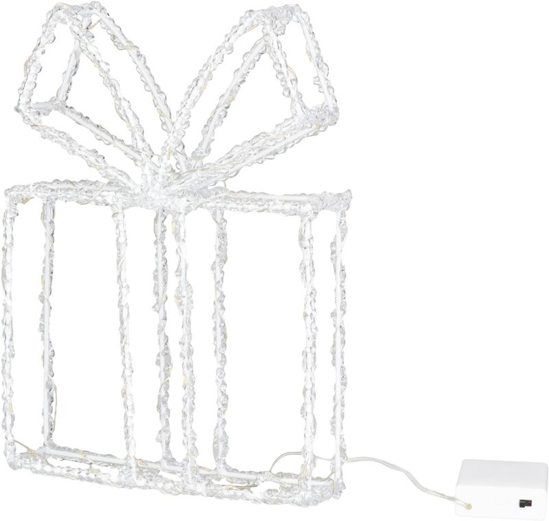 Dekorácia má rozmery 21x5x28 cm a svojím jedinečným dizajnom v tvare darčeka sa stane krásnym doplnkom v interiéri aj exteriéri. Napájanie zabezpečujú 2 batérie typu AA, vďaka čomu je možné dekoráciu umiestniť kdekoľvek bez nutnosti pripojenia do siete.