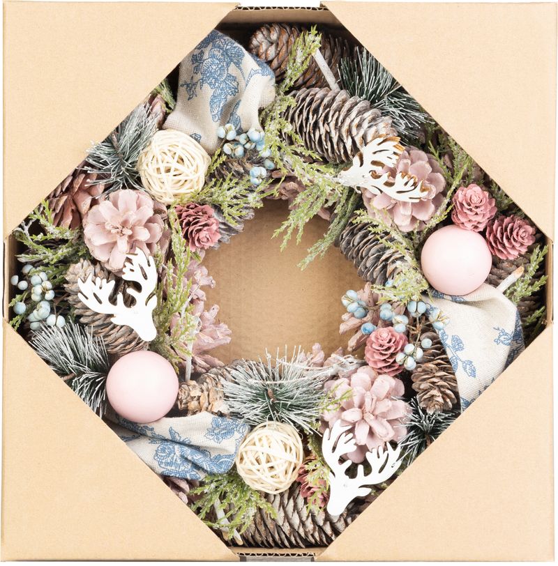 Dizajnový vianočný veniec MagicHome prinesie do vášho domova nádych elegancie a sviatočnej atmosféry. Veniec je zdobený prírodnými šiškami, dekoratívnymi kvetmi a ozdobnými guľôčkami v ružovo-oranžových tónoch, ktoré vytvárajú moderný a pritom teplý vzhľad.