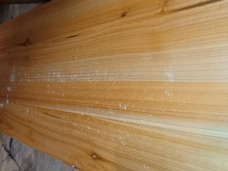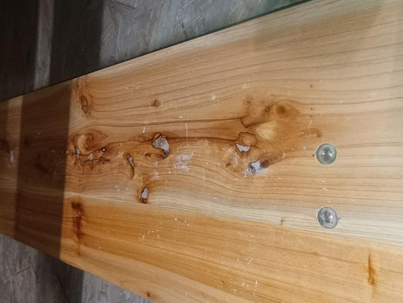 DEFECT DESCRIPTION: Various damages, scratches, cracks, and chipped paint on the table and bench tops.