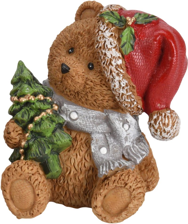 Rozkošná vianočná dekorácia Medveď s čiapkou prinesie do vášho domova veselú a útulnú sviatočnú atmosféru. Medvedík v červenej čiapke a šále, ktorý drží malý vianočný stromček, je symbolom radosti, tepla a vianočnej pohody. Ideálny ako milý doplnok na poličku, stôl alebo k vianočnej výzdobe.
