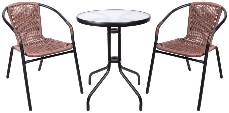 The set is a great addition to balconies or terraces, for a pleasant sitting. The set consists of two chairs and a table. The constructions of the chairs are made of metal with a diameter of 25 x 1 mm for strength and stability. The remaining surface of the chairs is covered with a brown, polyrattan surface, which looks very natural. The dimensions of one chair are 55 x 50 x 70 cm and the load capacity is 120 kg. The table construction is also made of metal with a diameter of 22 x 1 mm. The upper part of the table is made of tempered glass, 5 mm thick. The overall size of the table is 60 x 70 mm. The set is very easy to maintain, simply wipe it with a damp cloth to remove any dirt.