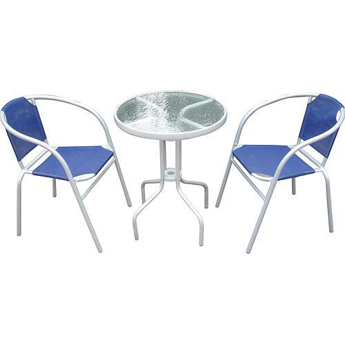 Balkónový set pozostáva z dvoch stoličiek a jedného okrúhleho stola. Set je ideálnym funkčným doplnkom pre posedenie, počas teplých letných dní. Hlavné konštrukcie nábytkov sú vyrobené z kovu. Povrch stoličiek je pokrytý pevnou sieťovinou modrej farby. Povrch stola je zasa vyrobený z tvrdeného skla. Rozmery jednej stoličky sú 60 x 71 cm a rozmery stola sú 72 x 59 cm. Set je potrebné umiestniť na rovný povrch.